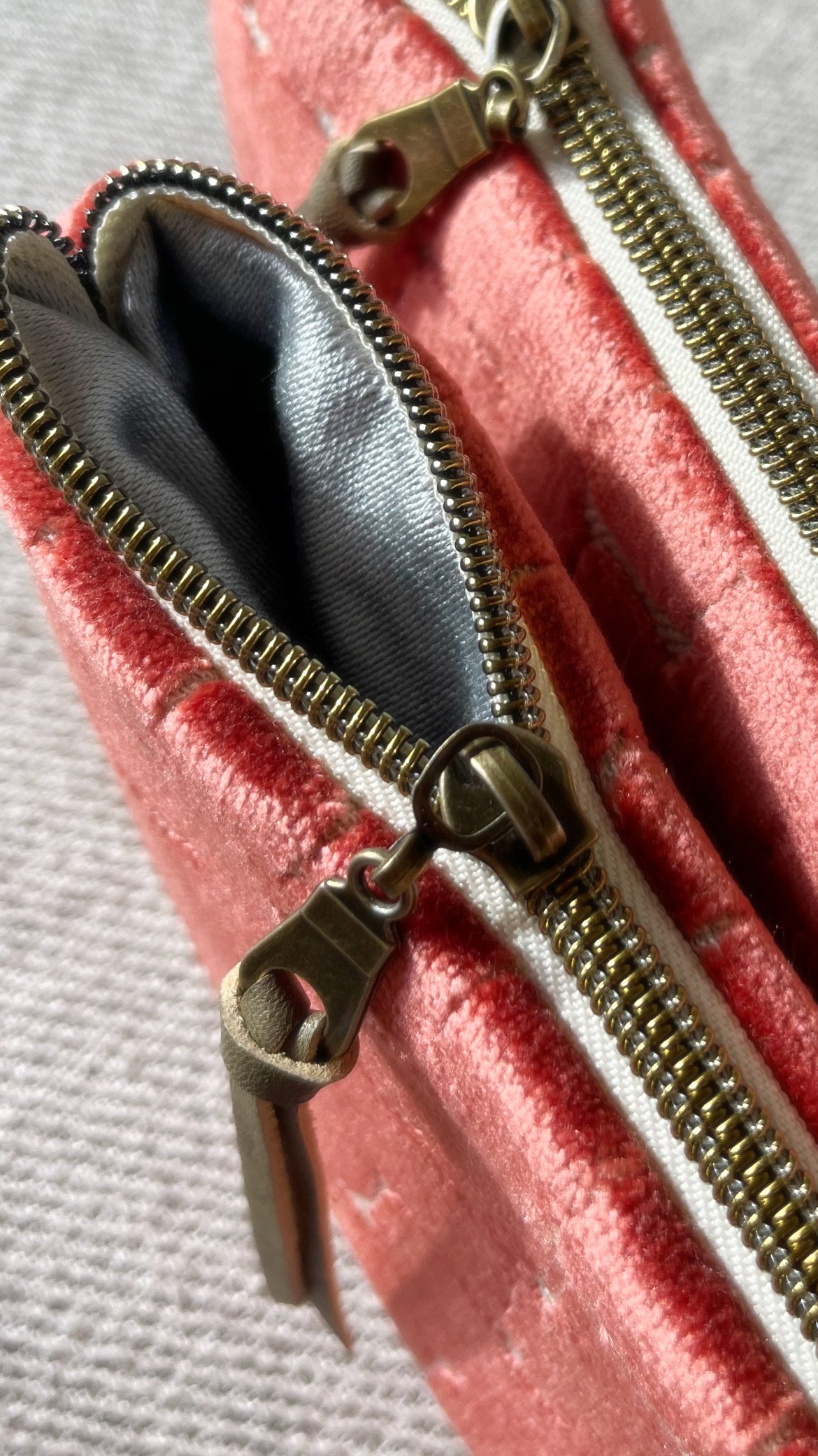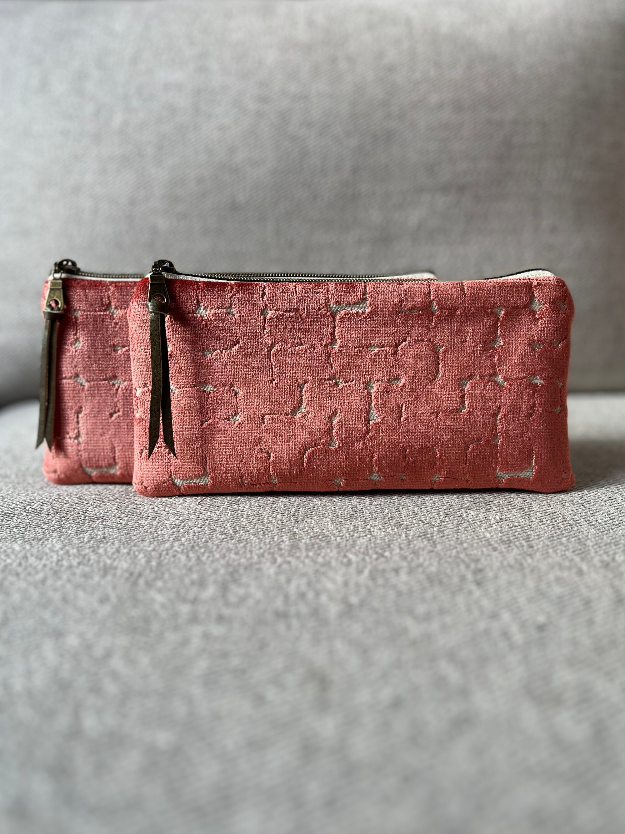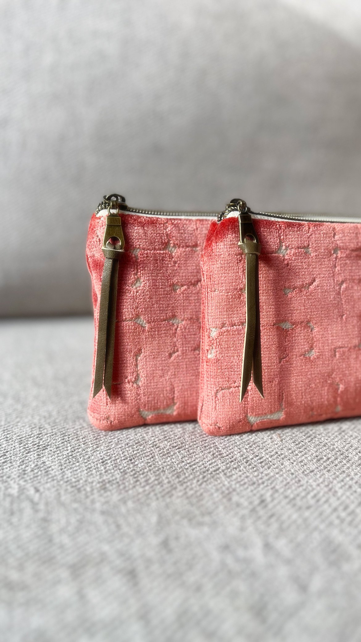 Texture, texture, texture…a clutch made of a silk-velvet coral fabric with an abstracted geometric pattern. The velvet is the softest velvet you'll ever touch. A gray satin lines this clutch.